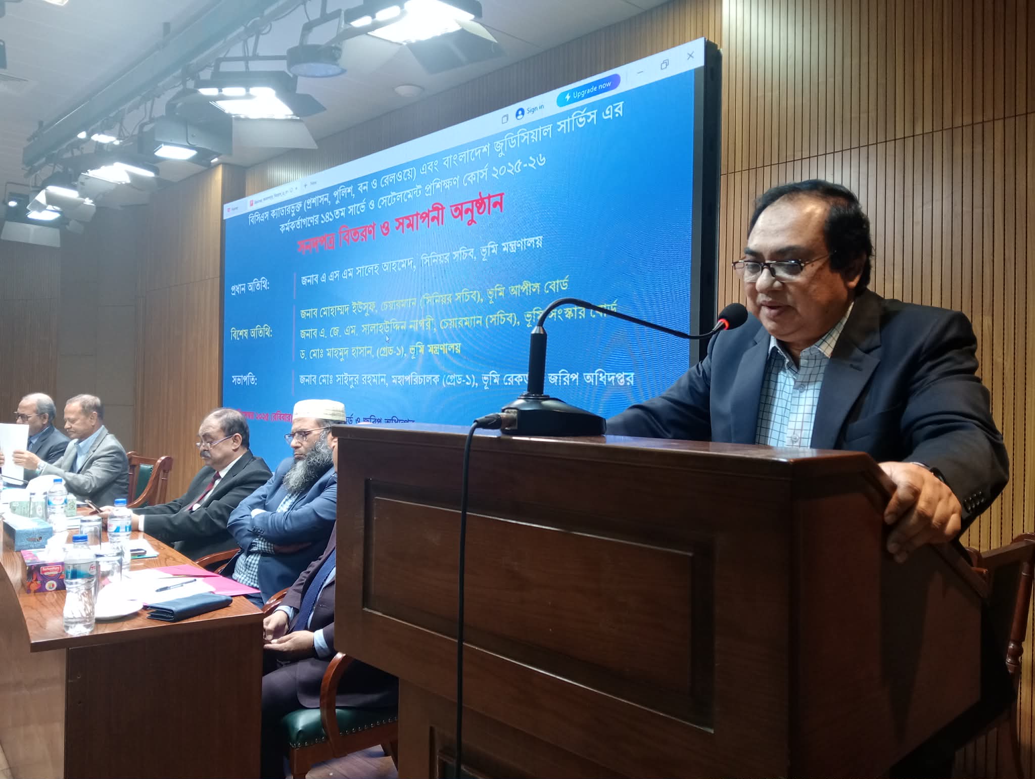 আজ রাজধানীর ভূমি ভবনের কেন্দ্রীয় সিমেনার হলে ১৪১তম ‘সার্ভে ও সেটেলমেন্ট প্রশিক্ষণ কোর্সে’র সনদপত্র বিতরণ ও সমাপনী অনুষ্ঠানে তিনি এসব কথা বলেন। ৫২ দিন ব্যাপি প্রশিক্ষণে বিসিএস ক্যাডারভুক্ত (প্রশাসন,পুলিশ,বন ও রেলওয়ে) এবং বাংলাদেশ জুডিসিয়াল সার্ভিস এর ৬০ জন কর্মকর্তা অংশগ্রহণ করেন। ভূমি রেকর্ড ও জরিপ অধিদপ্তর
