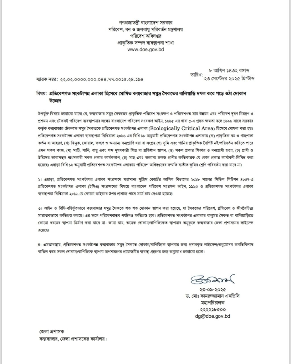 আজ পরিবেশ অধিদপ্তরের মহাপরিচালক ড. মোঃ কামরুজ্জামান এনডিসি স্বাক্ষরিত এক চিঠিতে কক্সবাজার জেলা প্রশাসককে এ ব্যবস্থা নিতে বলা হয়েছে।