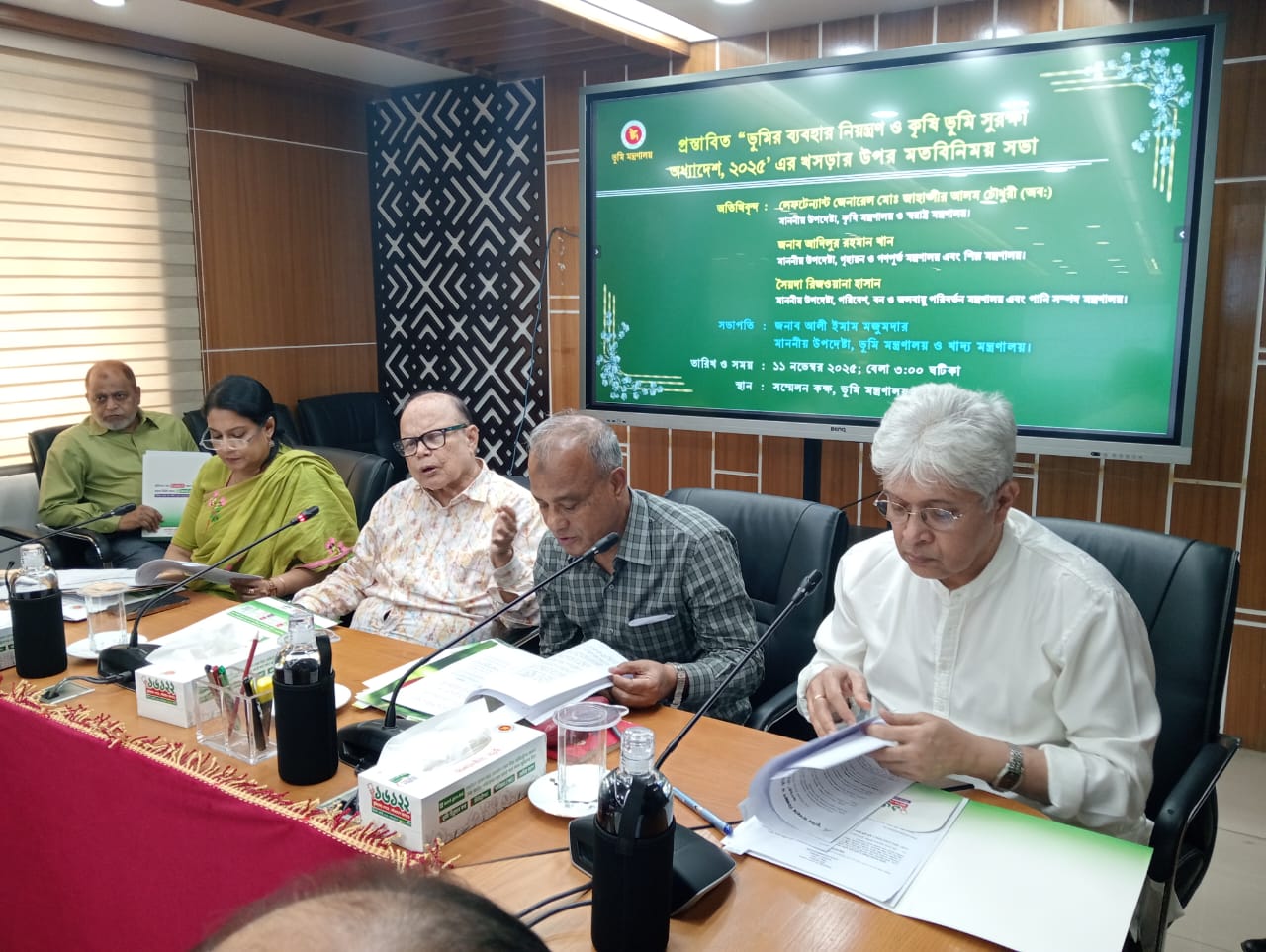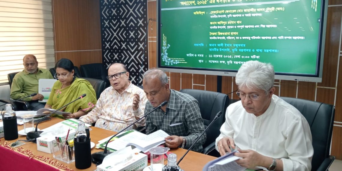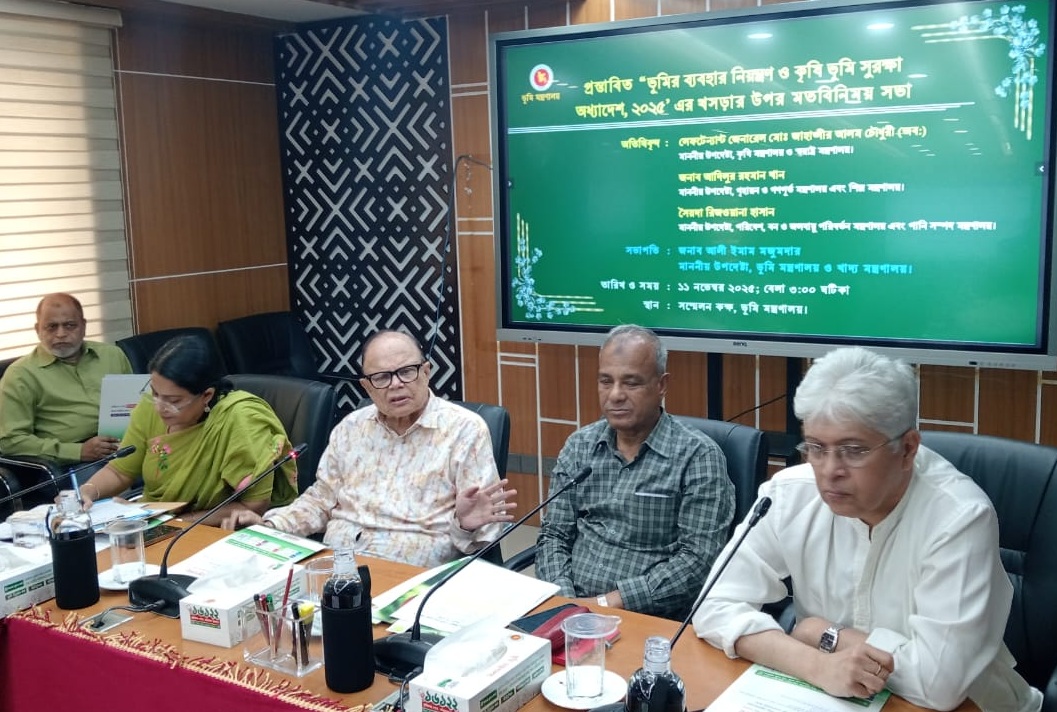 আজ ভূমি মন্ত্রণালয়ের সভাকক্ষে ভূমি উপদেষ্টার সভাপতিত্বে অনুষ্ঠিত ‘ভূমির ব্যবহার নিয়ন্ত্রণ ও কৃষিভূমি সুরক্ষা অধ্যাদেশ,২০২৫’ এর খসড়ার উপর ‘’মতবিনিময়’’ সভায় তিনি এসব কথা বলেন।