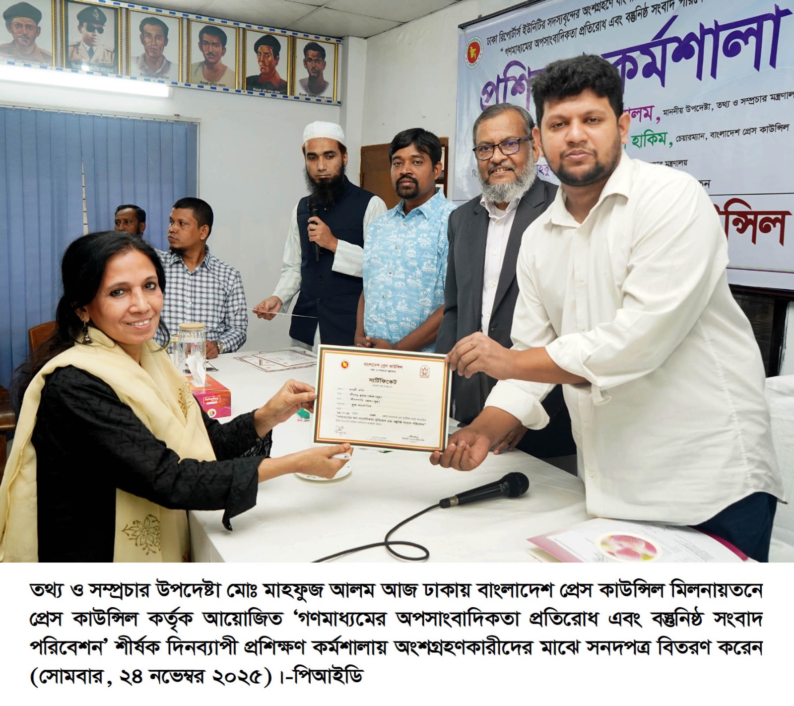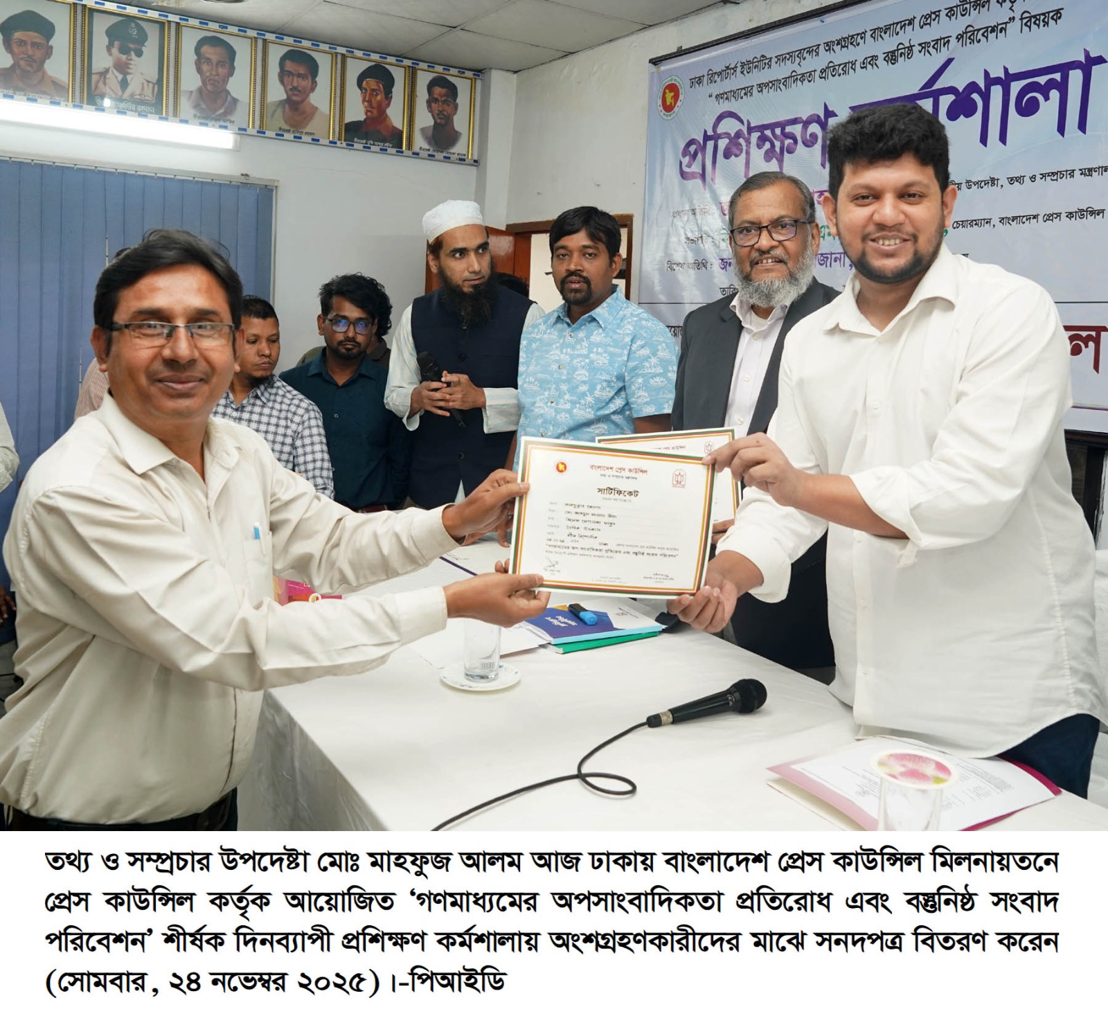 বিলাল হুসাইন, চিফ রিপোর্টার:ঢাকা, ৯ অগ্রহায়ণ (২৪ নভেম্বর):তথ্য ও সম্প্রচার উপদেষ্টা মোঃ মাহফুজ আলম বলেছেন, গুজব ও অপতথ্যের বিরুদ্ধে গণমাধ্যমকে শক্ত অবস্থান নিতে হবে। একই সঙ্গে গণমাধ্যমের ওপর জনগণের আস্থাহীনতা দূর করতে হবে। আজ ঢাকায় বাংলাদেশ প্রেস কাউন্সিলে ঢাকা রিপোর্টার্স ইউনিটির সদস্যবৃন্দের অংশগ্রহণে ‘গণমাধ্যমের অপসাংবাদিকতা প্রতিরোধ এবং বস্তুনিষ্ঠ সংবাদ পরিবেশন’ বিষয়ক প্রশিক্ষণ কর্মশালায় প্রধান অতিথির বক্তৃতায় উপদেষ্টা এসব কথা বলেন। বাংলাদেশ প্রেস কাউন্সিল এই কর্মশালার আয়োজন করে।