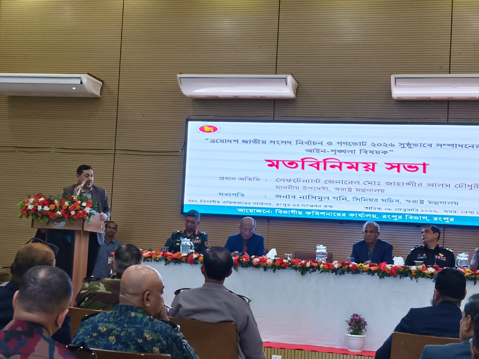 উপদেষ্টা আজ দুপুরে রংপুর বিভাগীয় কমিশনারের কার্যালয়ের সম্মেলন কক্ষে ‘ত্রয়োদশ জাতীয় সংসদ নির্বাচন ও গণভোট-২০২৬’ সুষ্ঠুভাবে সম্পাদনের লক্ষ্যে রংপুর বিভাগীয় প্রশাসন আয়োজিত আইনশৃঙ্খলা বিষয়ক মতবিনিময় সভায় প্রধান অতিথির বক্তব্যে এ নির্দেশ দেন।