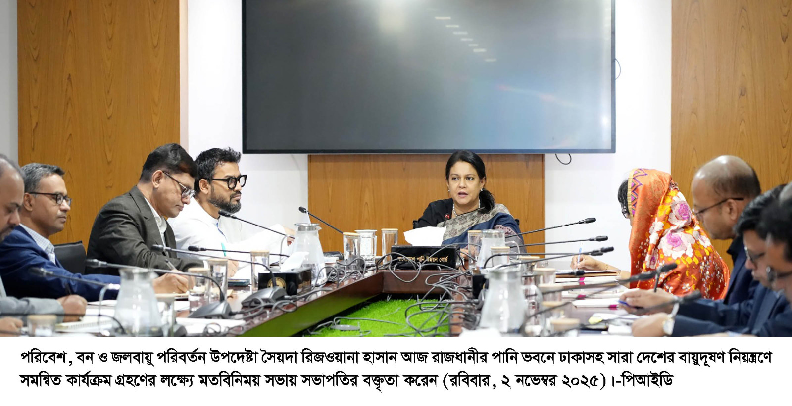 পরিবেশ উপদেষ্টা জানান, ঢাকার বায়ুদূষণ রোধে ডিগ্রেডেড এয়ারশেড ঘোষিত সাভার এলাকার কোনো অবৈধ ইটভাটা চালু থাকতে দেওয়া হবে না। এ বিষয়ে প্রয়োজনীয় ব্যবস্থা নিতে সংশ্লিষ্ট কর্মকর্তাদের নির্দেশনা দেওয়া হয়েছে। তিনি আরও বলেন, ভবন নির্মাণ বা মেরামতকাজ ঢেকে রেখে করতে হবে, অন্যথায় আইন অনুযায়ী ব্যবস্থা নেওয়া হবে। বিভিন্ন উদ্যানে ঝরাপাতা ও বর্জ্য পোড়ানো বন্ধ করতে হবে। ময়লা-আবর্জনা পুড়িয়ে বায়ুদূষণকারীদের বিরুদ্ধে কঠোর ব্যবস্থা নেওয়া হবে।