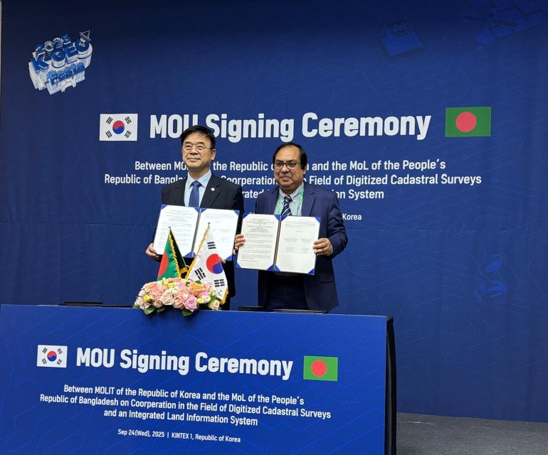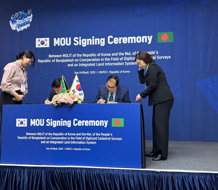 দক্ষিণ কোরিয়ায় আয়োজিত 2025 K- GEO Festa-এ দক্ষিণ কোরিয়ার Ministry of Land. Infrastructure and Transport এবং বাংলাদেশ সরকারের ভূমি মন্ত্রণালয়ের মধ্যে ডিজিটাইজড ক্যাডাস্ট্রাল সার্ভে এবং সমন্বিত ভূমি তথ্য ব্যবস্থাপনা সিস্টেম বাস্তবায়ন বিষয়ে একটি সমঝোতা স্মারক (MoU) স্বাক্ষরিত হয়। এর মাধ্যমে দেশে ভূমিসেবায় নতুন দিগন্তের উন্মোচন হলো।