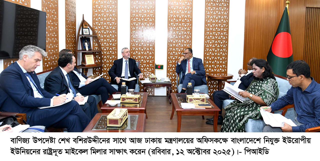 চিফ রিপোর্টার:ঢাকা : ১২ অক্টোবর ২০২৫ খ্রিস্টাব্দ.বাণিজ্য উপদেষ্টা শেখ বশিরউদ্দীন এর সাথে বাংলাদেশে নিযুক্ত ইউরোপীয় ইউনিয়নের রাষ্ট্রদূত মাইকেল মিলারের নেতৃত্বে এক প্রতিনিধিদল বৈঠক করেছেন।