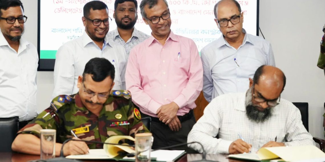 আজ রাজধানীর পান্থপথে পানি ভবনে অনুষ্ঠিত অনুষ্ঠানে পানি উন্নয়ন বোর্ডের পক্ষে স্বাক্ষর করেন যশোর পানি উন্নয়ন সার্কেল, খুলনার তত্ত্বাবধায়ক প্রকৌশলী ও প্রকল্প পরিচালক বি. এম. আব্দুল মোমিন। সেনাবাহিনীর পক্ষে স্বাক্ষর করেন ২৪ ইঞ্জিনিয়ার কনস্ট্রাকশন ব্রিগেডের প্রকল্প পরিচালক লে. কর্নেল মামুন উর রশিদ, এএফডব্লিউসি, পিএসসি।