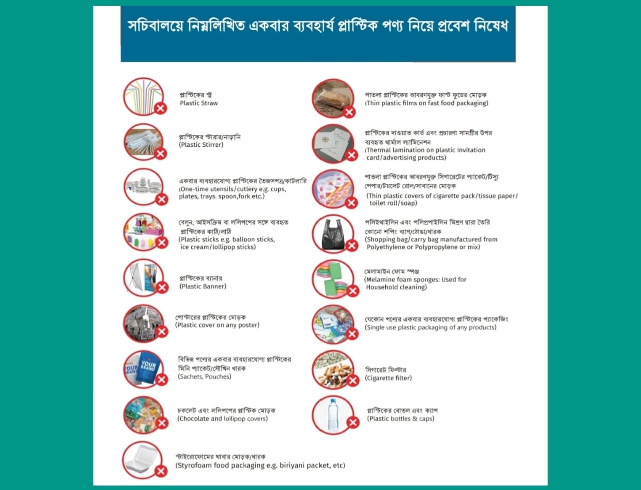 আগামী ৫ অক্টোবর ২০২৫ থেকে সচিবালয়কে এসইউপি মুক্ত করতে সংশ্লিষ্ট সকলের সহযোগিতা কামনা করা হয়েছে।