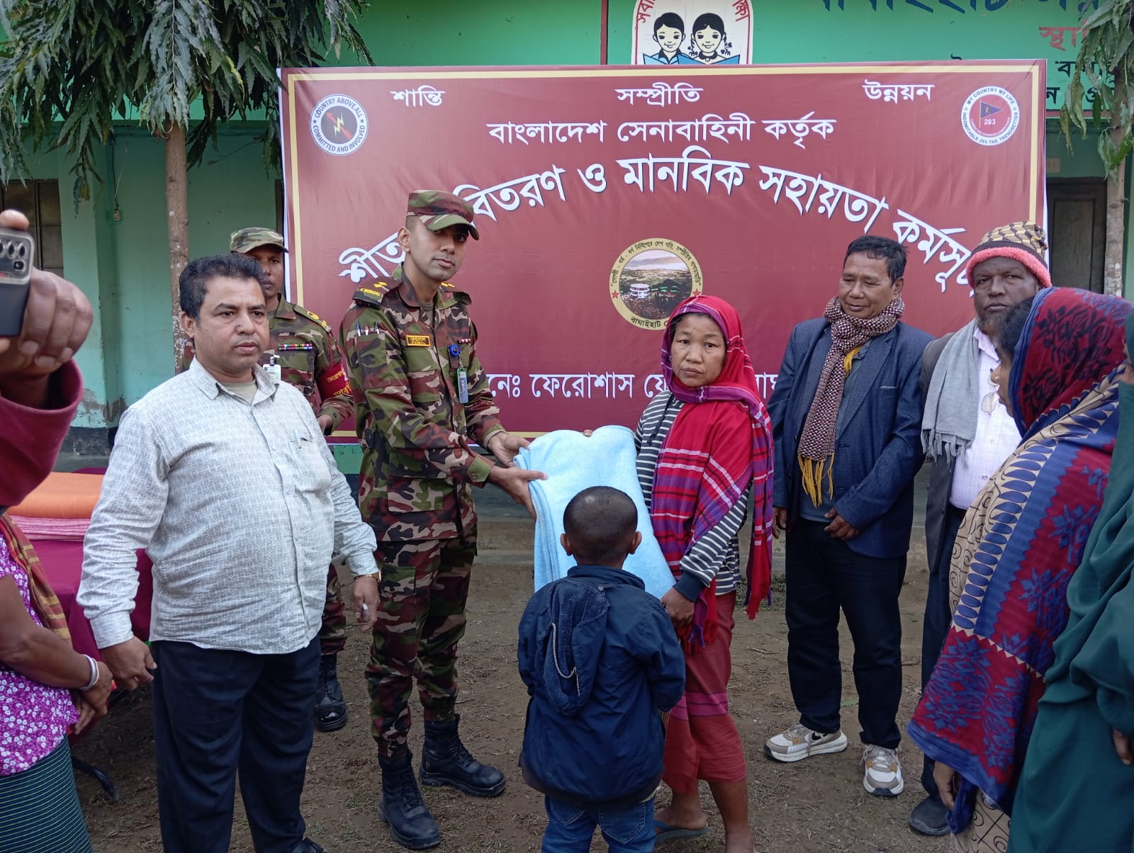 রোজ মঙ্গলবার, ০৬ জানুয়ারি-২০২৬ ইং তারিখ সাজেক ইউনিয়নে ০৪ নং ওয়ার্ডের বিভিন্ন গ্রামের হত দরিদ্র ও দুস্থ পাহাড়ী ও বাঙালি পরিবারের মাঝে একশত শীতবস্ত্র বিতরণ করেছেন,বাঘাইহাট জোনের,জোন কমান্ডারের তত্ত্বাবধানে,উপ-অধিনায়ক মেজর মোঃ সালমান সিদ্দিক পিএসসি,১৪ ই বেঙ্গল, বাঘাইহাট জোন এর উপস্থিতিতে,বাঘাইহাট সরকারি প্রাথমিক বিদ্যালয় মাঠে ৬নং আদর্শ পাড়া, কিয়াংঘাট, সেগুন বাগান, আনসার টিলা ও পার্শ্ববর্তী এলাকার একশত স্থানীয় পাহাড়ি ও বাঙ্গালি জনসাধারণের মাঝে শীতবস্ত্র কম্বল এবং শীতের পোশাক বিতরণ করেছে সেনাবাহিনীর বাঘাইহাট জোন।