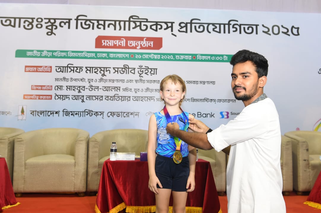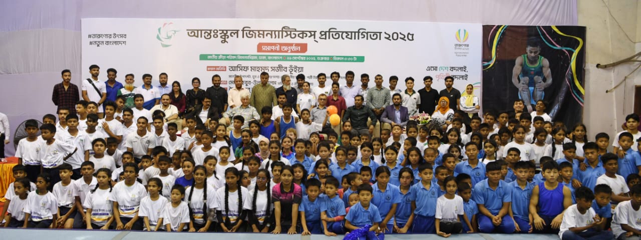 তারুণ্যের উৎসব ২০২৫ উদযাপন উপলক্ষে আজ জাতীয় ক্রীড়া পরিষদ জিমন্যাসিয়ামে বাংলাদেশ জিমন্যাস্টিকস ফেডারেশনের আয়োজনে আন্ত:স্কুল জিমন্যাস্টিকস প্রতিযোগিতার সমাপনী ও পুরস্কার বিতরণী অনুষ্ঠানের আয়োজন করা হয়।